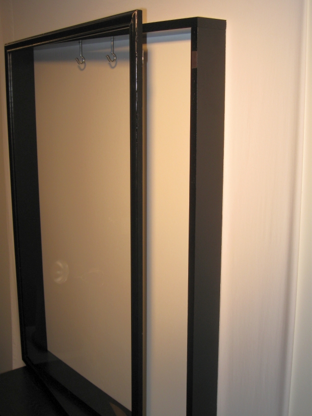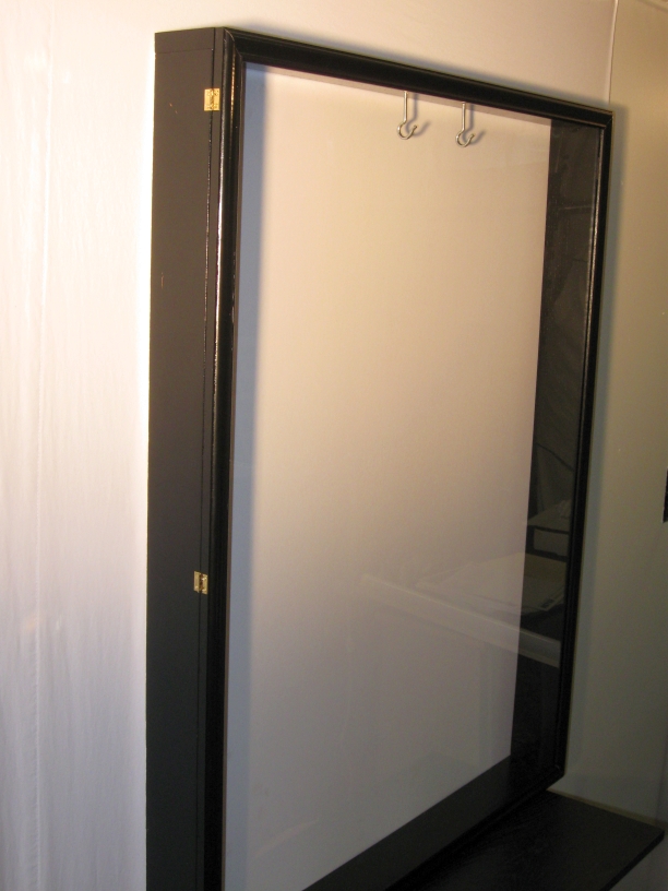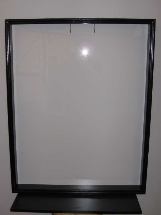 So, here is what I came up with. A 32"x40" frame x 3.75" deep. Made of 1x boards cut to size, assembled and painted. The door was made of frame stock (which I painted to match). A piece of 1/8" plexiglass, and the backing is a White Archival Matboard.
